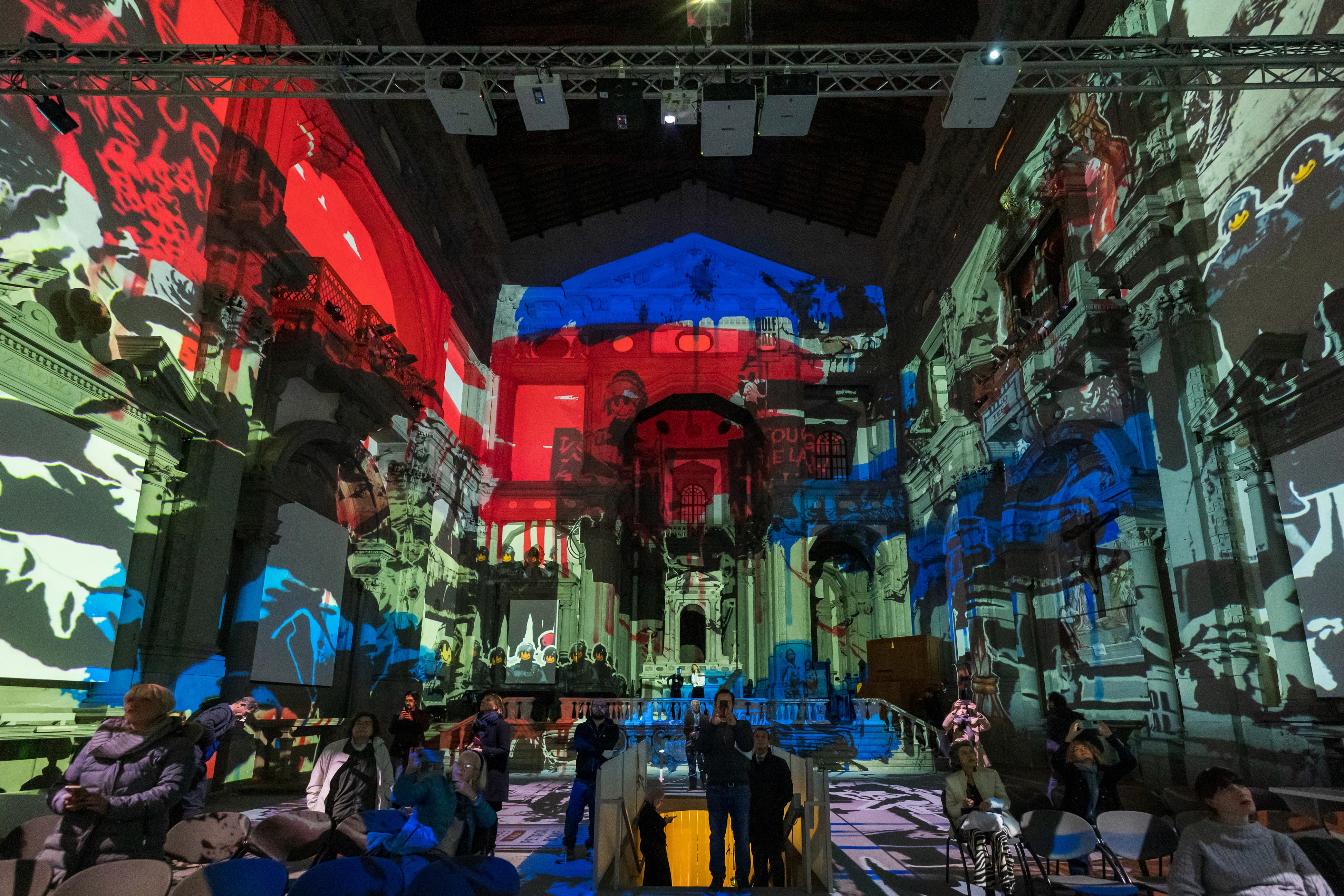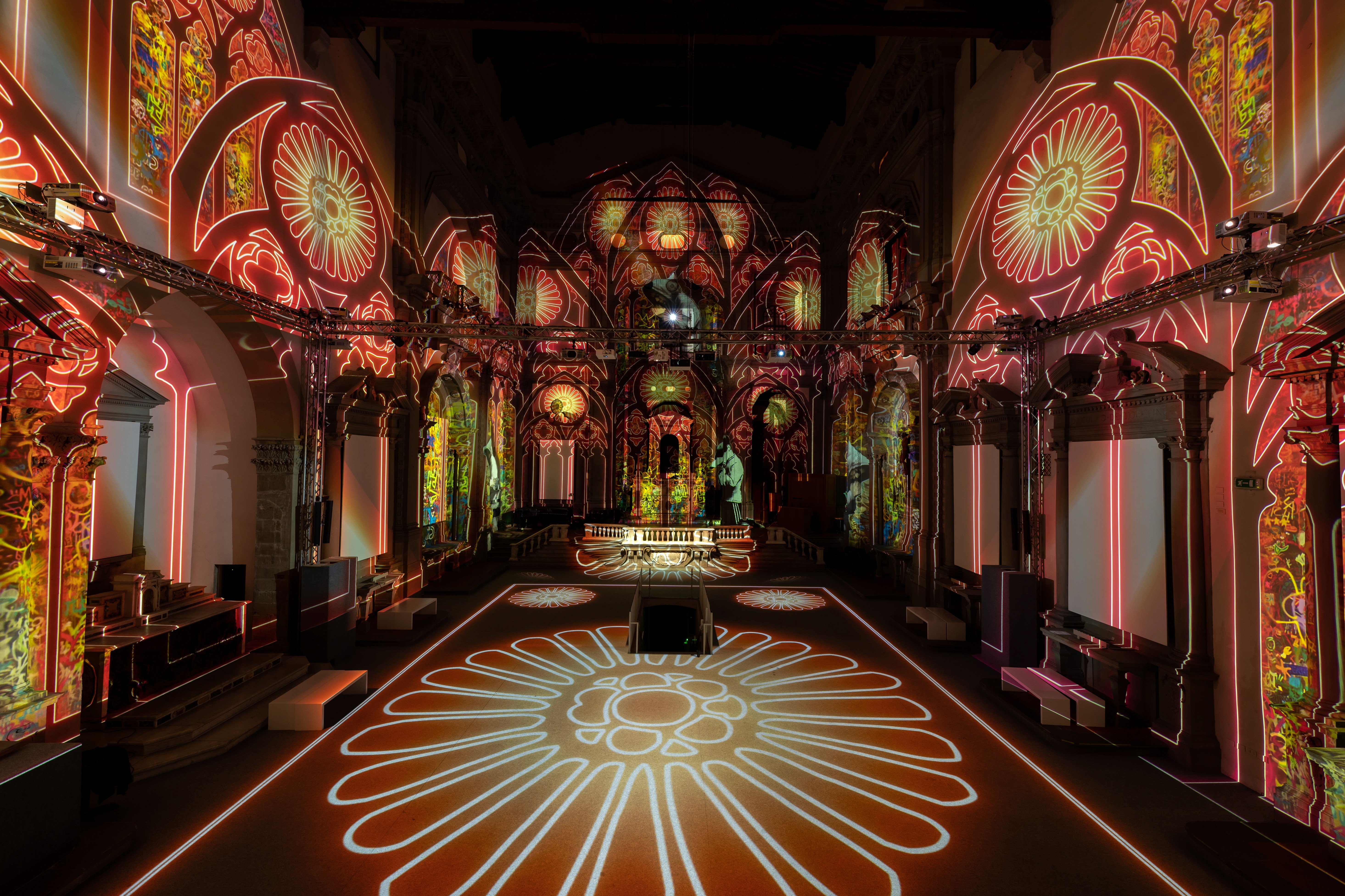 Hosted in the millenary Church of Santo Stefano al Ponte, just steps from Florence’s Ponte Vecchio, Inside Banksy was a large-scale immersive exhibition that transformed the raw energy of the street into a multi-sensory journey. Through a fusion of projections, lights, music and augmented reality, visitors were invited to step inside the world of the mysterious British artist. The exhibition unfolded across more than 3,000 square meters of surfaces, with walls and floors brought to life by over 200 animated images. A 35-minute visual narrative explored Banksy’s most iconic works, framed by social commentary, satire, and cultural references. The show included interactive areas like “Be Banksy”, where guests could create their own graffiti, and an immersive VR experience that reconstructed lost murals in their original urban contexts. Underground, in the crypt, an evocative space recreated the atmosphere of Bristol’s underground scene — the birthplace of Banksy’s early art — combining archival footage, documentaries, and music installations.